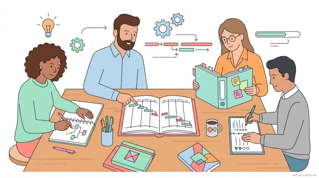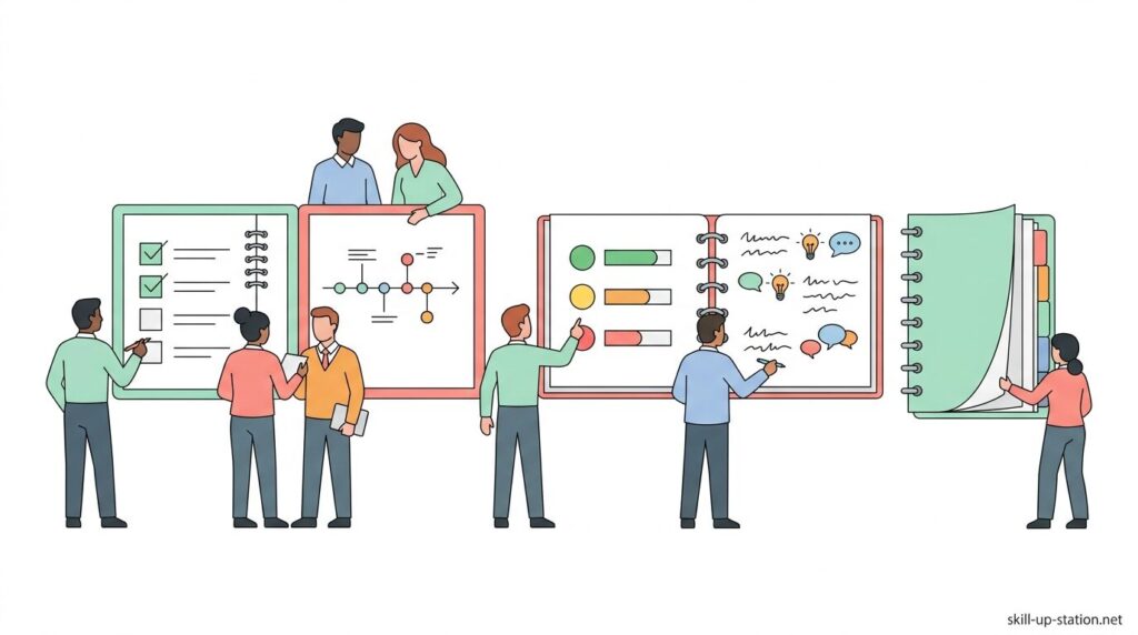 ノートを使ったプロジェクトマネジメントは、A4ノート1冊に目的、タスク、進捗、課題を日付と行動単位で記録し、ページ単位で管理する方法です。1ページに1タスクを割り当て、開始日・期限日・完了条件を明確に記入し、作業ごとに進捗と課題を更新することで、状況をその場で判断できます。