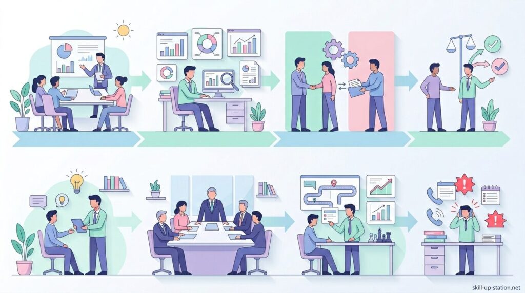 課長はチームの業務管理と担当案件の対応を同時に行うため、日々の業務量は多くなりやすい役職です。たとえば10人のチームを担当する課長は、メンバーの売上管理、日報確認、顧客対応、見積承認などを毎日処理します。一方で部長は、部門全体の売上や利益の管理、部門会議や経営会議への参加、各課長との調整が主な仕事になります。