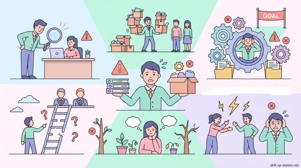 部長は担当部門の責任者ですが、視野が狭くなると判断を誤りやすくなります。現場業務に深く入りすぎたり、部下に仕事を任せられなかったりすると、組織全体の成果に影響が出ることがあります。ここでは、部長が仕事を進めるうえで陥りやすい失敗のパターンを整理します。