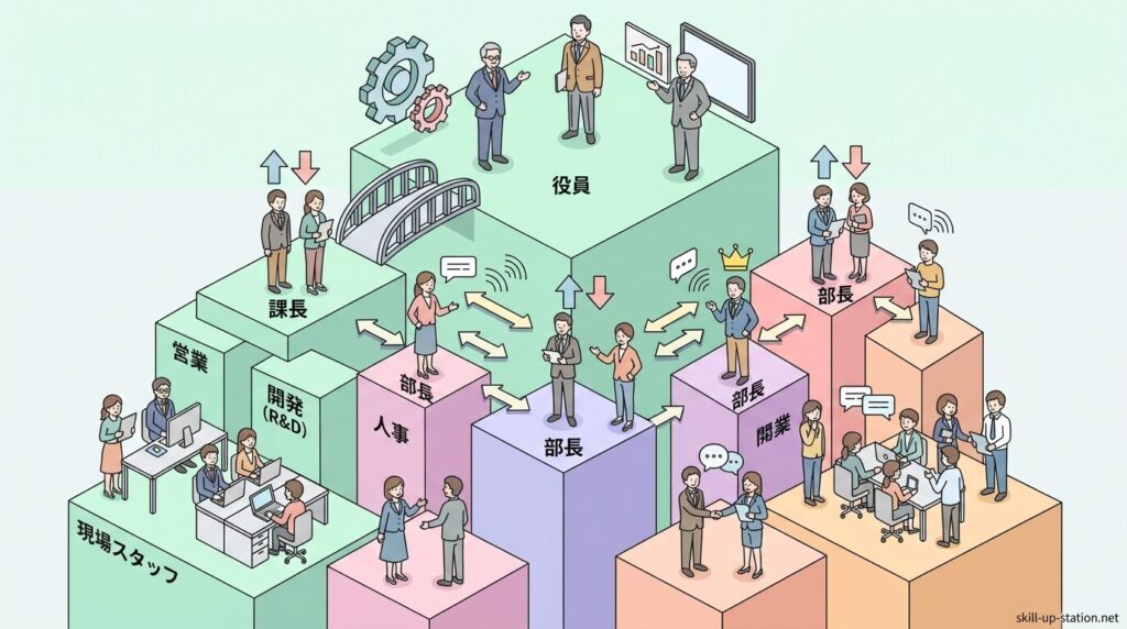 中間管理職は、会社の中で経営層と現場の社員のあいだに立ち、組織を円滑に動かす役割を担う立場です。経営層の方針を現場に伝える一方で、現場の状況や課題を上層部に報告しながら、チームとして成果を出す責任も負います。ここでは、中間管理職が組織の中でどのような立場を担っているのかを見ていきます。