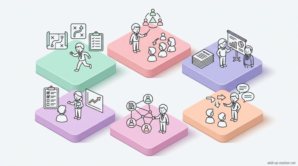 中間管理職は、単に役職として部署をまとめるだけでなく、日々の業務を具体的に管理する仕事を担っています。部下に業務の指示を出して進捗を確認し、KPIや数値目標をもとに成果を管理しながら、部下の育成や評価面談も行います。また、部署内だけでなく他部署や関係者との調整も重要な仕事の一つです。ここでは、中間管理職が日常業務の中で行う具体的な仕事内容について見ていきます。