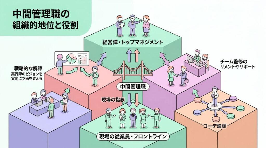 このように中間管理職は、会社の目標と現場の業務をつなぐ立場として、チームの成果を管理しながら組織の目標達成を支える重要な役割を担っています。