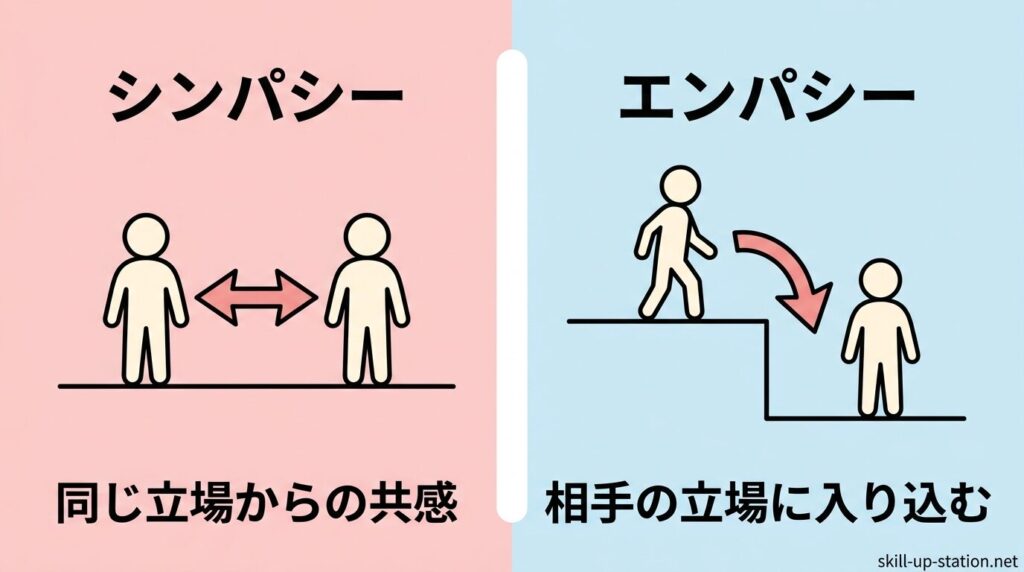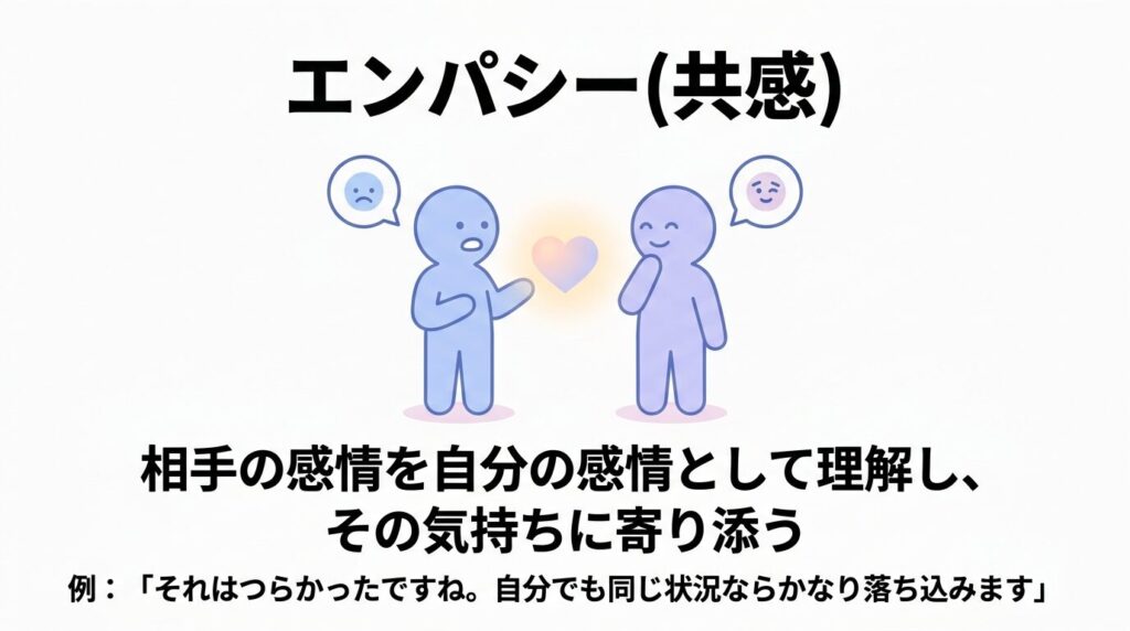 エンパシーは「相手の気持ちを自分のことのように受け止めて返す共感の言葉」、シンパシーは「相手の出来事や状況を外側から見て気の毒だと感じて伝える同情の言葉」です。違いは、感情の位置です。相手が感じている悔しさ・悲しさ・不安といった感情をそのまま言葉にして返すならエンパシー、相手に起きた出来事や置かれている状況を見て「大変でしたね」「つらい状況でしたね」と伝えるならシンパシーです。