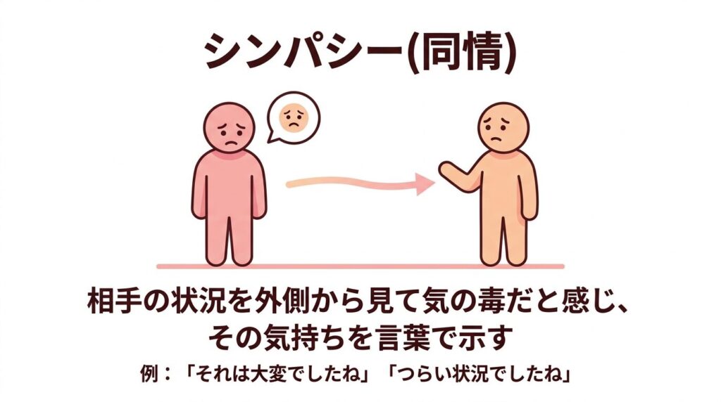 相手の出来事を聞いたあと、その状況をかわいそうだと受け止めて言葉を返す行動がシンパシーです。