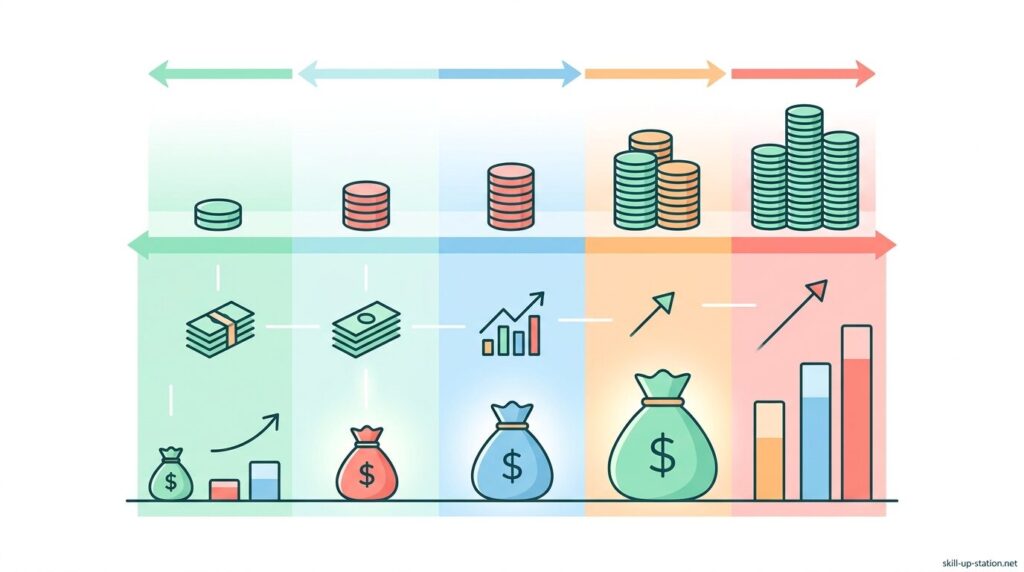 会社員PMは月給制で、年収500万円〜800万円の範囲で固定収入を受け取ります。担当プロジェクトが遅延しても、基本的に報酬は変わりません。一方でフリーランスPMは案件単位で契約し、1案件あたり月額60万円〜120万円前後、稼働時間140時間〜180時間といった条件で収入が決まります。