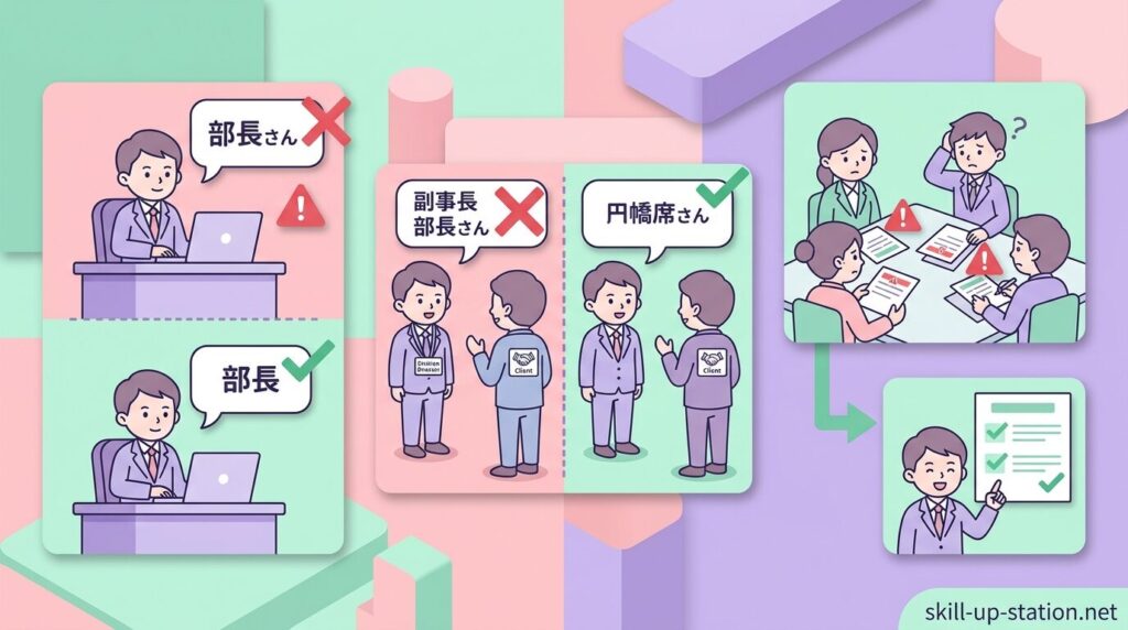 本部長の敬称でよくある間違いには、「本部長様」と書いてしまう、社外で役職だけで呼ぶ、自社の本部長に敬称を付けるといったものがあります。社内と社外でのルールを理解して使い分けることで、メールや文書でも適切な敬称を使えるようになります。