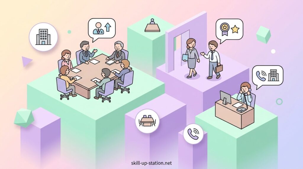 社内で本部長を呼ぶときは、会話・会議・社内メールなど場面によって呼び方が少し変わります。基本は役職名で呼びますが、会議では名前を付けて呼ぶこともあり、社内メールでは役職を敬称として使う書き方になります。ここでは、社内で本部長を呼ぶときの具体的な呼び方を場面ごとに整理します。