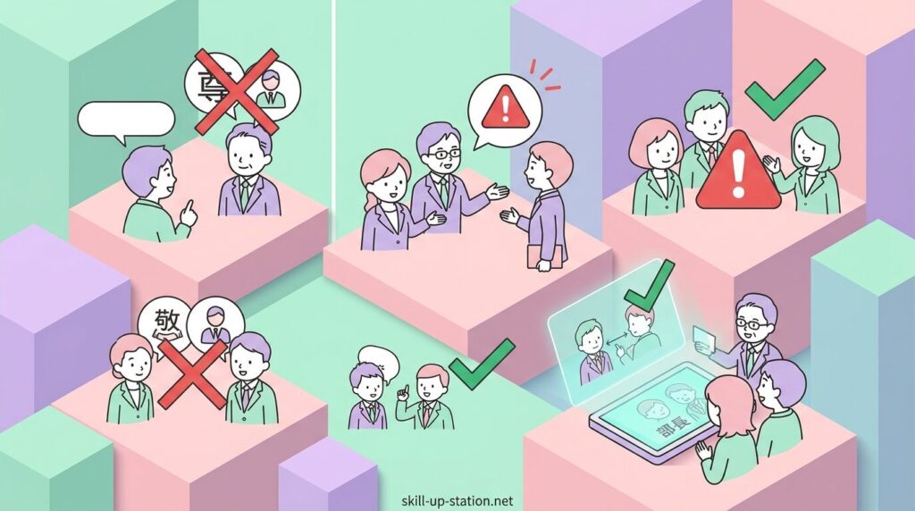 課長の敬称は基本ルールが決まっていますが、メールや文書では間違った書き方をしてしまうケースも少なくありません。特に「役職と敬称を重ねる」「社外での呼び方を誤る」「自社の課長に敬称を付けてしまう」といったミスがよく見られます。ここでは、課長の敬称でよくある代表的な間違いを確認します。