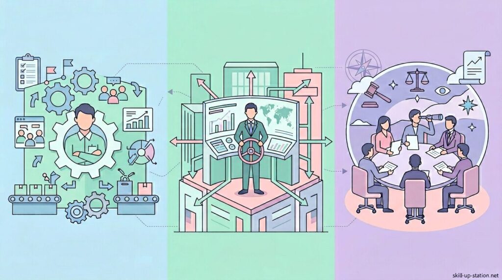 本部長は事業や組織を統括する役職ですが、執行役員や取締役は会社全体の経営に関わる役職です。役割や責任の範囲が異なるため、同じ管理職でも位置づけは大きく変わります。ここでは、本部長と執行役員・取締役の役割の違いを順番に整理します。