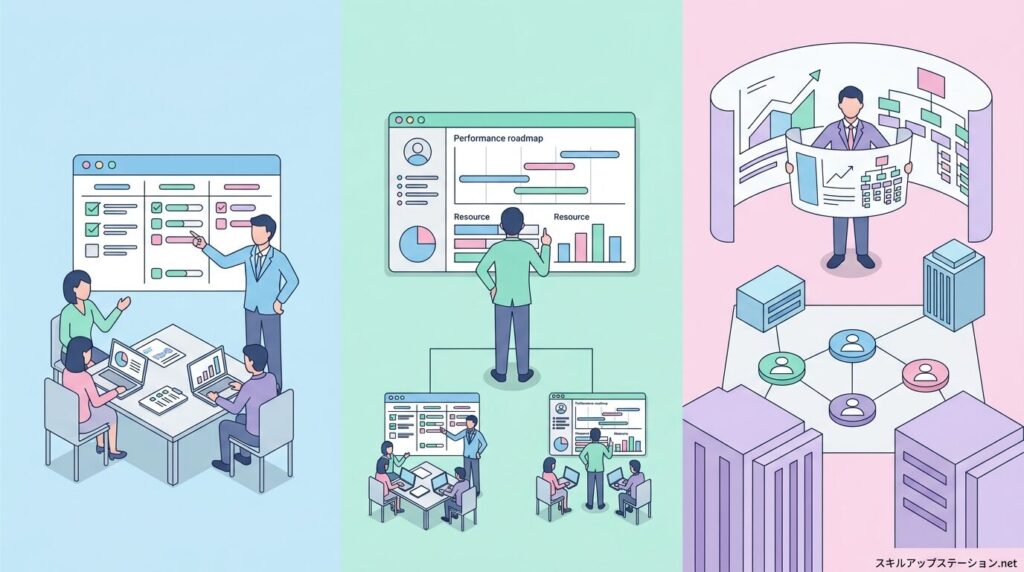 課長になると5人〜20人程度のチームの業務管理と部下の評価を担当し、部長は2〜5の課をまとめて部門全体の成果を管理します。本部長は複数の部門を統括し、本部単位の売上や業務計画を管理します。さらに上位の役職として執行役員は経営計画に基づいて事業の運営を指揮し、取締役は事業計画や投資など会社全体の経営判断を決定します。