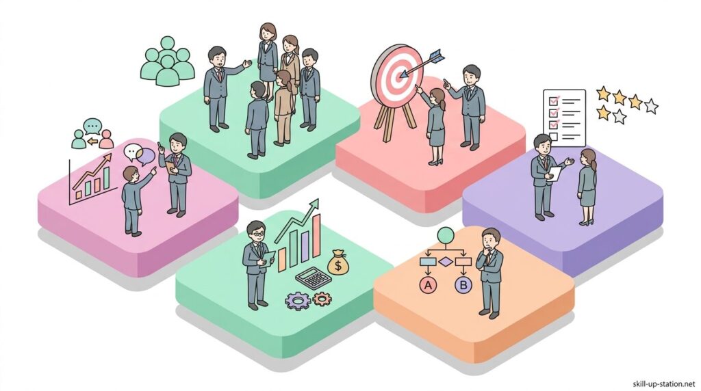 管理職の主な役割には、部門やチームの目標設定、業務の進捗と成果の管理、部下の育成や評価、そして部署間や関係者との調整があります。また、具体的な仕事内容として、業務指示と進捗管理、KPIや数値目標の管理、人材育成と評価面談、経営方針を現場に伝える役割なども担います。