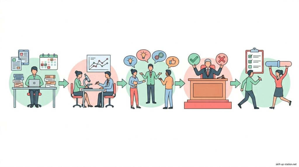 ここでは、レビューがどのような手順で進められるのかを、状況や成果物の確認から評価・フィードバック、そして改善や是正対応までの流れに沿って順番に整理していきます。
