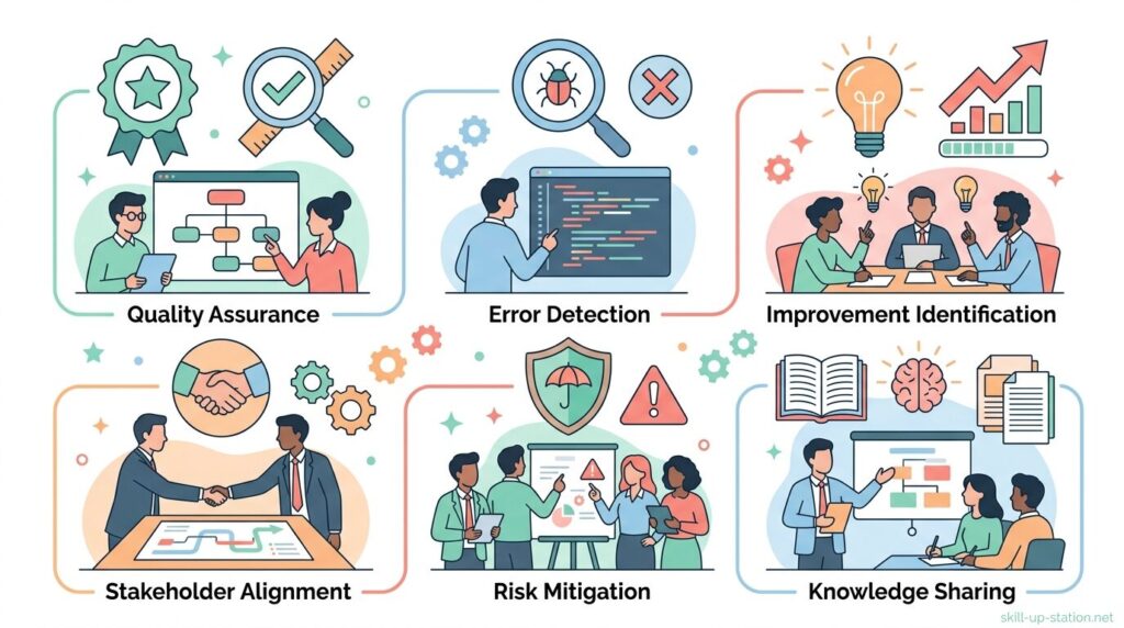 ここでは、レビューが具体的にどのような目的で行われるのかを、品質確認・進捗確認・リスクの早期発見という3つの視点に分けて順番に整理していきます。