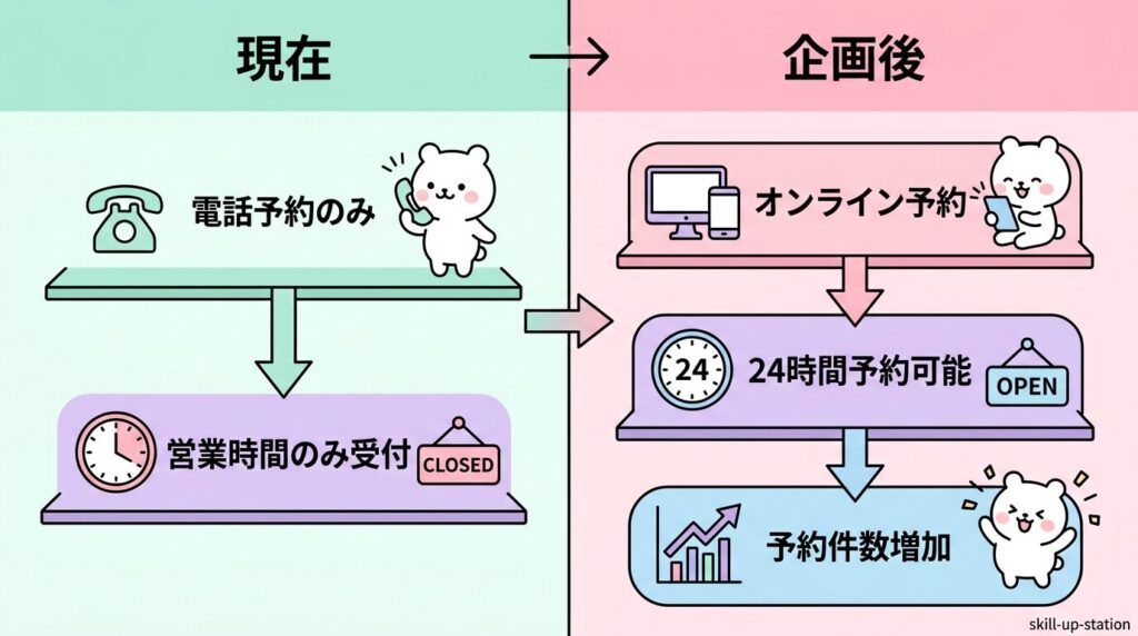 現在は電話予約のみで受付しており、営業時間外の予約を受け付けることができないため、機会損失が発生しています。オンライン予約システムを導入し、スマートフォンやパソコンから24時間予約できる仕組みを提供することで、サービス開始から6か月以内に有料会員500人を獲得することを目標とします。