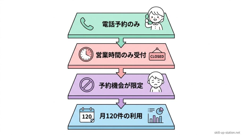現在の予約受付は電話のみで対応しており、1日の予約件数は平均30件、月間では約120件の利用にとどまっています。営業時間外は予約受付ができないため、利用希望者が予約できないケースが発生しています。