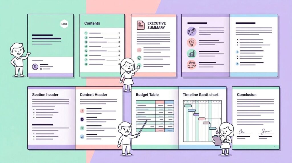 企画書は、思いついたアイデアをそのまま書く文書ではなく、目的・背景・具体的な内容・実行方法などを順序立てて整理し、読み手が計画の全体像を短時間で理解できる構成で作る必要があります。ここでは、企画書に一般的に含まれる基本的な構成項目と、それぞれの役割を説明します。