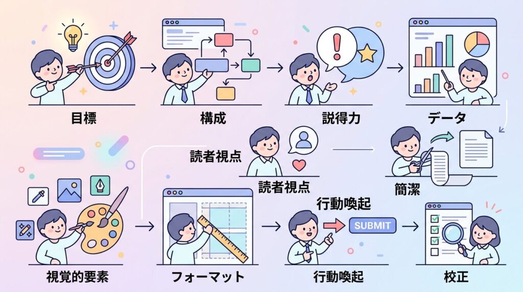 とはいえ、いざ作ろうとすると「構成はどうすればいいの?」「文章はどの順番で書けば伝わるの?」と迷ってしまいますよね。企画書は特別な文章のように感じられますが、ポイントを押さえて順番どおりに書いていけば、誰でも分かりやすく作ることができます。