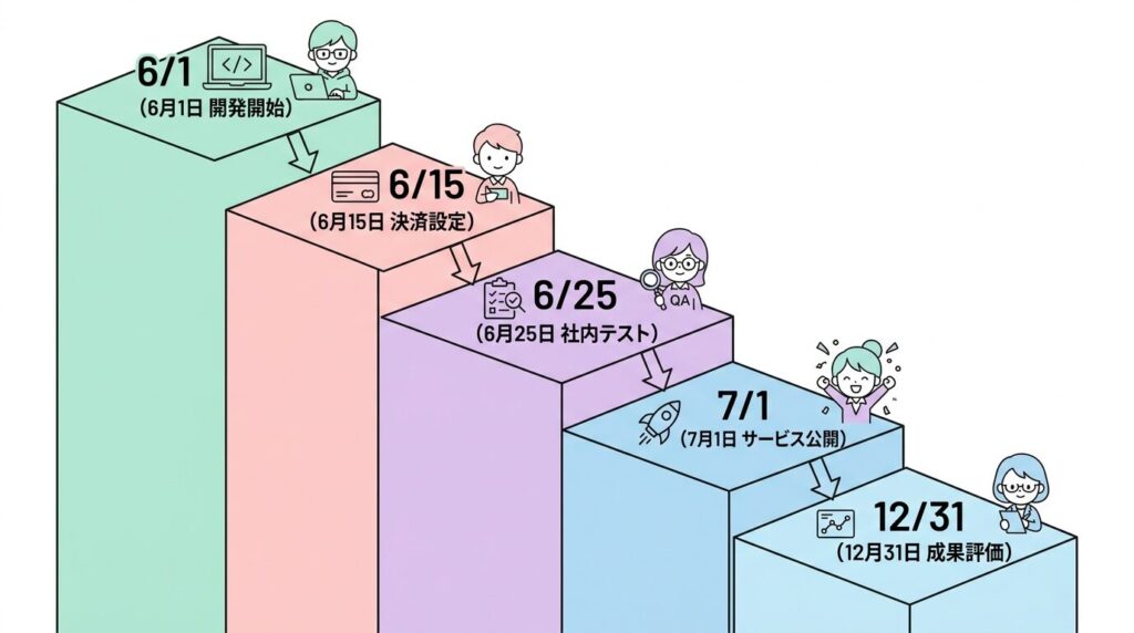 たとえば4月1日に企画を開始し、4月10日までに準備作業を完了し、4月15日から広告配信を開始し、6月30日までに売上結果を確認するといった日程を書きます。読み手はその日程を見て、準備期間や実行期間が現実的かどうかを判断します。
