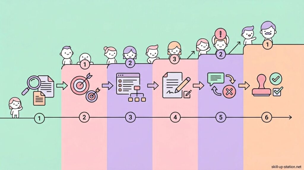 企画書は、いきなり書き始めるのではなく、目的や課題を整理し、実行方法や必要な条件を順番に固めながら作っていくと内容がまとまりやすくなります。ここでは、企画書を作成するときの基本的な流れを、目的の整理から予算やスケジュール作成まで順を追って説明します。