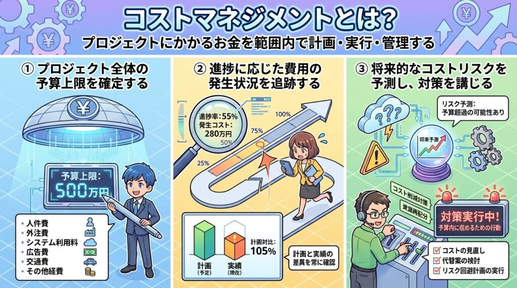 コストマネジメントとは、あらかじめ決めた予算の金額の中で、プロジェクトを最後までやり切るための具体的な管理のことです。