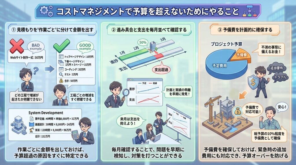 コストマネジメントは、「いくらまで使うのかを決める」「その金額を工程ごとに分ける」「実際に使った金額と計画を定期的に比べる」という3つの手順で進めます。順番は必ずこの通りです。