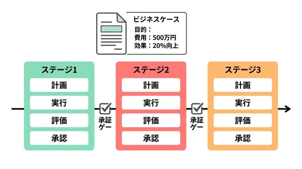 開始時にビジネスケースを作成して目的・費用・効果を数値で定義し、ステージ開始前に実行計画とリスクを明確にします。進行中はステージごとに進捗・コスト・品質を定期的に報告し、事前に設定した許容範囲を超えた場合のみ上位管理者にエスカレーションします。ステージ終了時には成果物と計画との差異を評価し、承認を得た場合にのみ次のステージへ進みます。