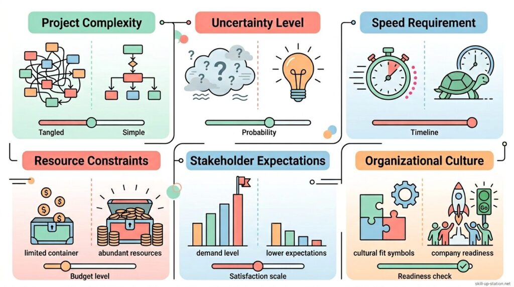 さらに、関係人数や要件確定率、変更回数、メンバーの経験年数といった具体的な条件によって、進め方を選び分ける必要があります。