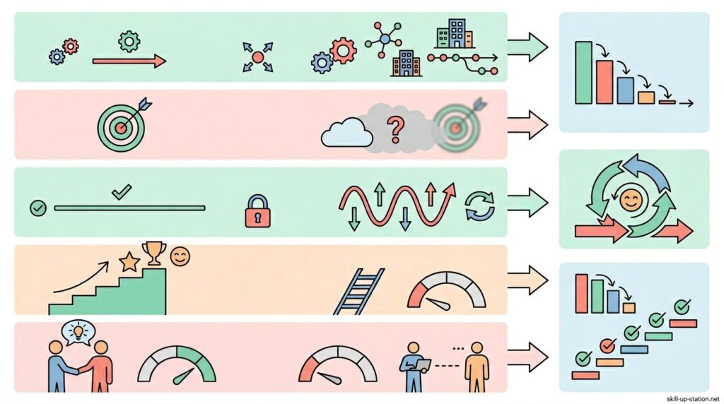 たとえば、納期が決まっている案件なのに柔軟さを重視した進め方を選んでしまい、途中で方向がぶれてしまうこともありますよね。