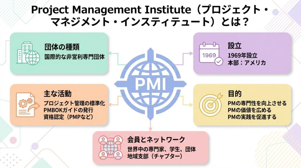 PMIは、プロジェクトマネジメントの進め方を体系的に整理し、実務で使える形で文書化している団体です。正式名称はProject Management Instituteです。