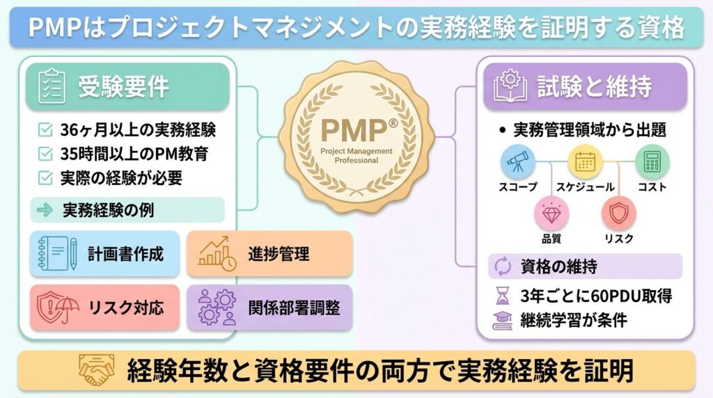 このため、PMPは「実際にプロジェクトを担当してきた人」であることを、経験年数と資格要件の両方で示せる資格です。