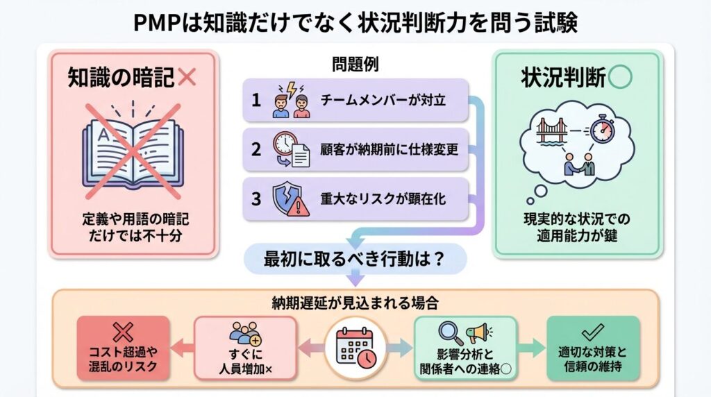 PMP試験では、定義や用語を覚えているだけでは正解できません。問題文には具体的な場面が提示されます。たとえば、「チームメンバー同士が対立している」「顧客が納期直前に仕様変更を求めている」「重大なリスクが顕在化した」といった状況です。