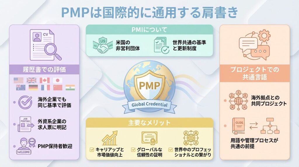 国内の社内認定資格とは異なり、国をまたいで同じ基準で評価される点が、PMPの特徴です。
