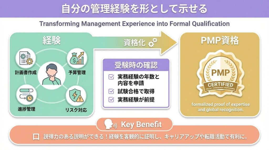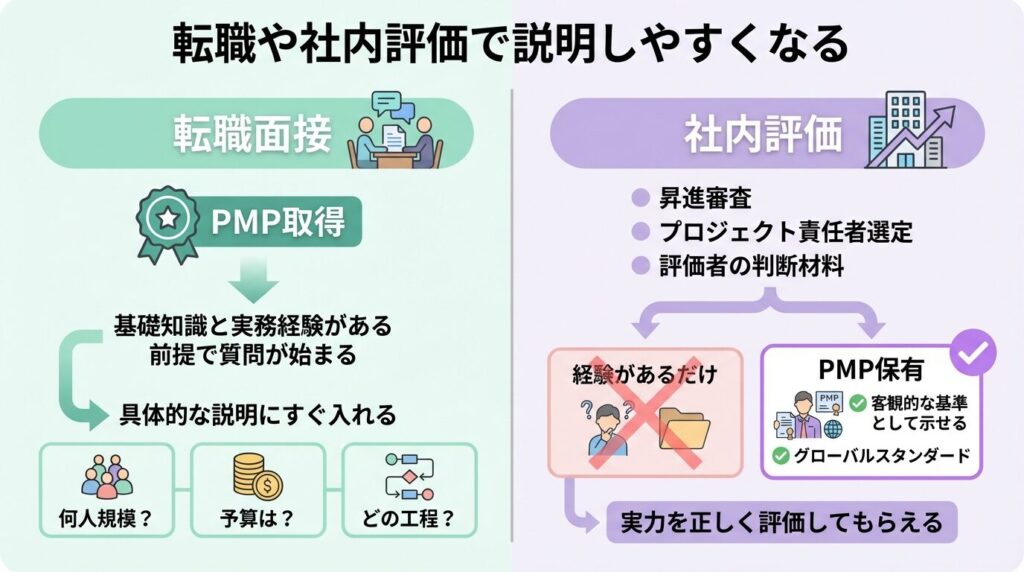 つまりPMPは、評価の場面で自分の経歴を説明する手間を減らし、話を具体的な実績の説明に集中させやすくします。