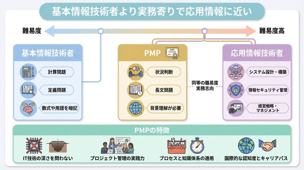 ただし、PMPはIT技術の深さを問う試験ではありません。問われるのは、変更管理の順番、関係者への報告の優先順位、リスク対応の手順といったプロジェクト管理の実務です。単純な知識量ではなく、実務の流れを理解しているかが難易度を左右します。