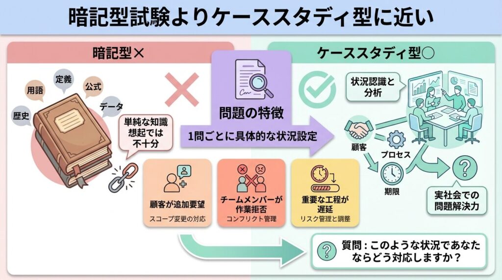 その中で、「最初に取るべき行動はどれか」を選ばせます。感覚的な対応ではなく、手順に沿った行動が求められます。たとえば、納期遅延が見込まれる場合、すぐに人員を増やすのではなく、影響範囲を分析し、変更管理手続きを通すという選択が正解になることがあります。