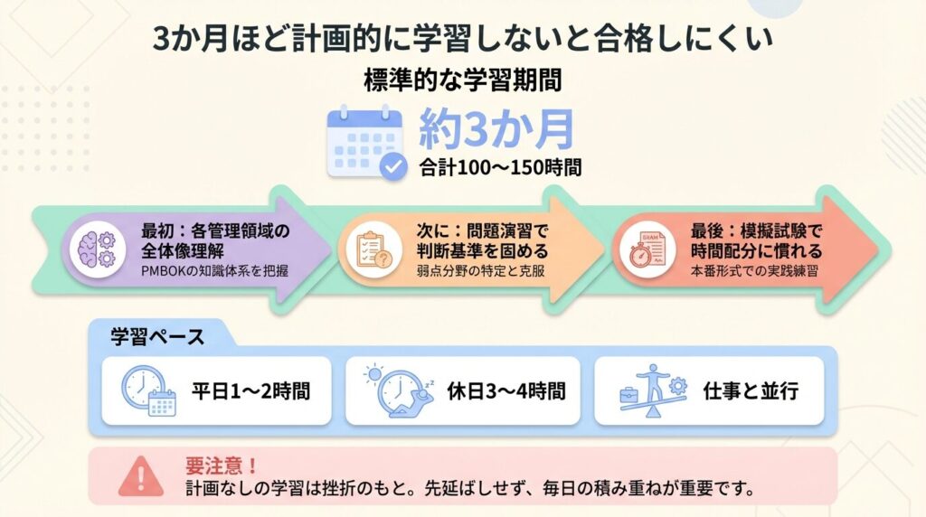 PMP試験は出題範囲が広く、短期間の対策では理解が追いつきません。多くの受験者は約3か月を目安に学習しています。平日1〜2時間、休日3〜4時間を確保し、合計100〜150時間ほどかける人が一般的です。