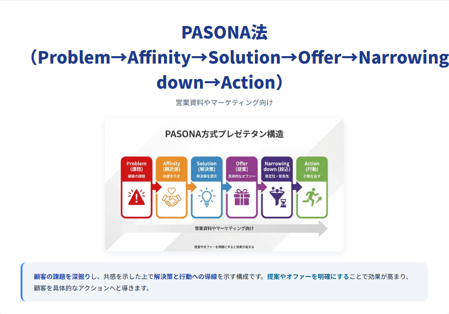 PASONA法(Problem→Affinity→Solution→Offer→Narrowing down→Action)