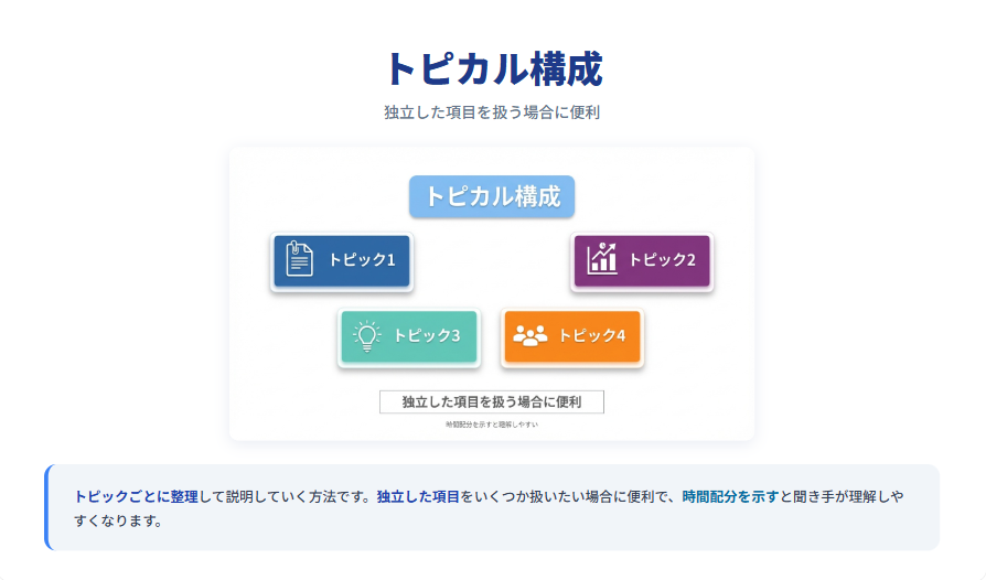 独立した項目をいくつか扱いたい場合に便利で、時間配分を示すと聞き手が理解しやすくなります。
