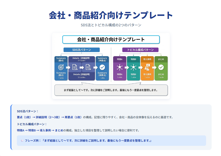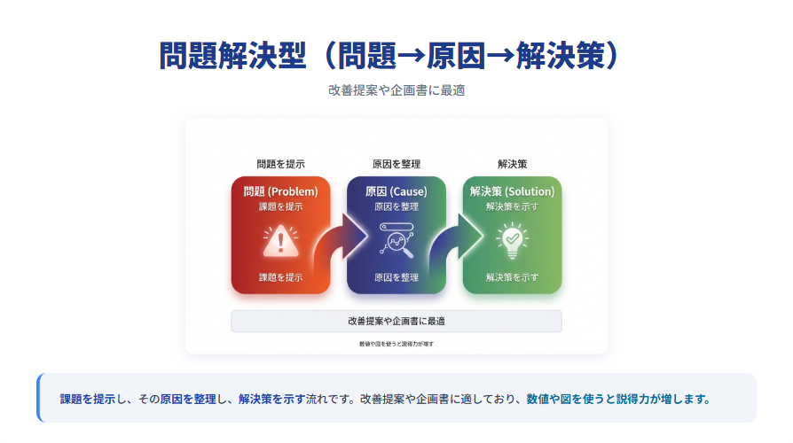 たとえば新商品の発表なら、「目的 → 市場分析 → 提案 → まとめ」のように進めます。どんな場面でも使いやすい基本の型です。
