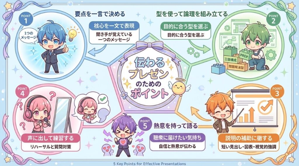 プレゼン本番では、まず結論を伝えることで聞き手の注意を引き、理由と具体例で納得を積み重ねてください。