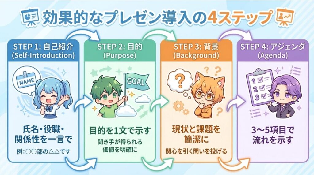 上記を場面に合わせて組み替えると、伝わりやすいプレゼンになります。