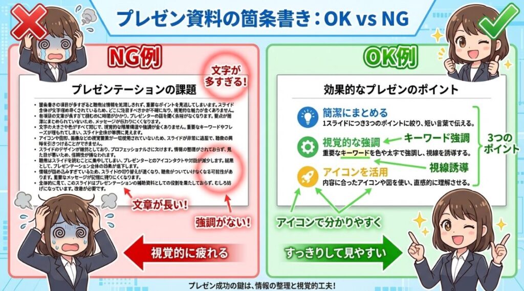 これらを意識して作ると、伝わりやすい資料になります。聞き手の視点で何度か見直してください。