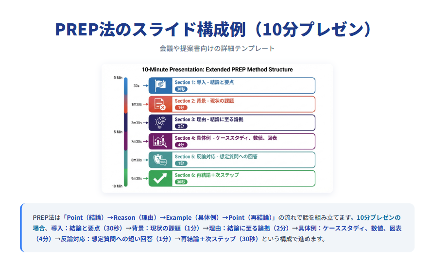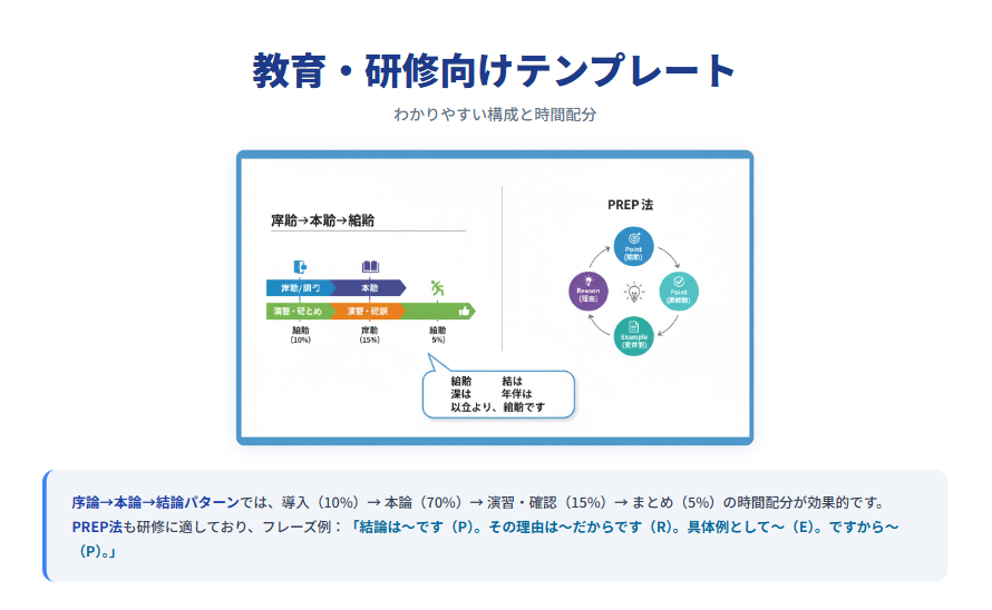 • フレーズ例(PREP):"結論は〜です(P)。その理由は〜だからです(R)。具体例として〜(E)。ですから〜(P)。"
