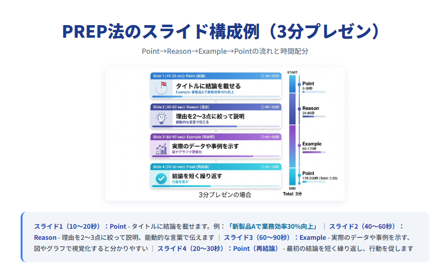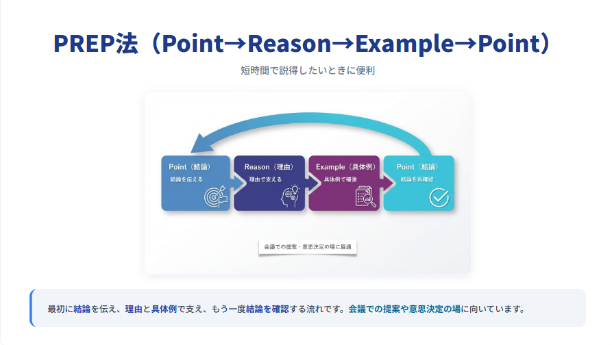 PREPは「Point(結論)→Reason(理由)→Example(具体例)→Point(再結論)」の流れで話を組み立てます。主張が明確になり、短時間で説得力を高められます。