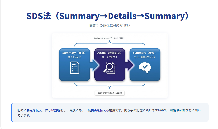 • SDS例:冒頭で要点を示す(1)→ 詳細説明(2〜3)→ 再び要点で締める(1)