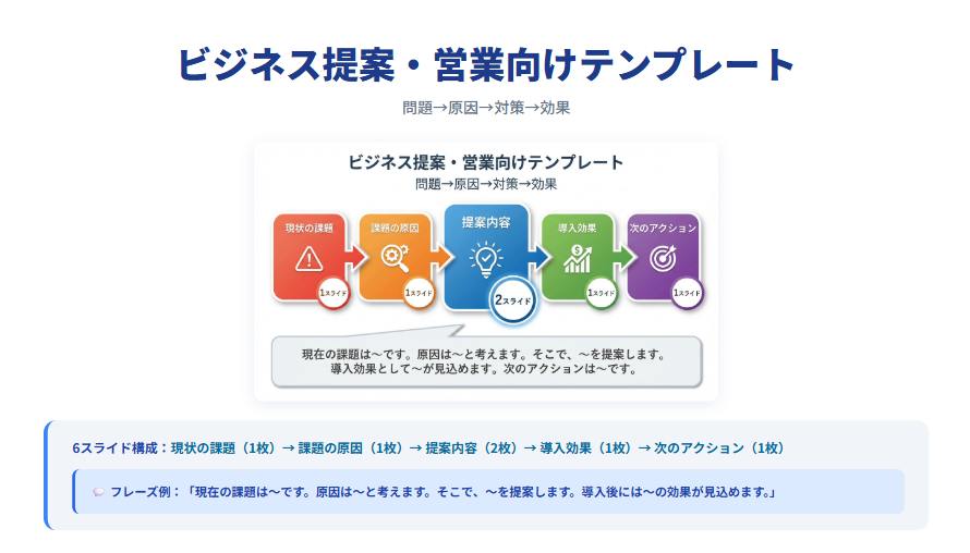 • フレーズ例:"現在の課題は〜です。原因は〜と考えます。そこで、〜を提案します。導入後には〜の効果が見込めます。"