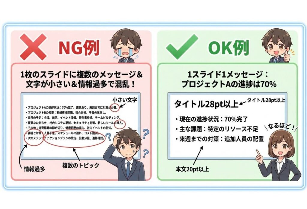 • フォントは読みやすさ優先で、タイトルは28ポイント以上、本文は20ポイント以上を目安にします。
