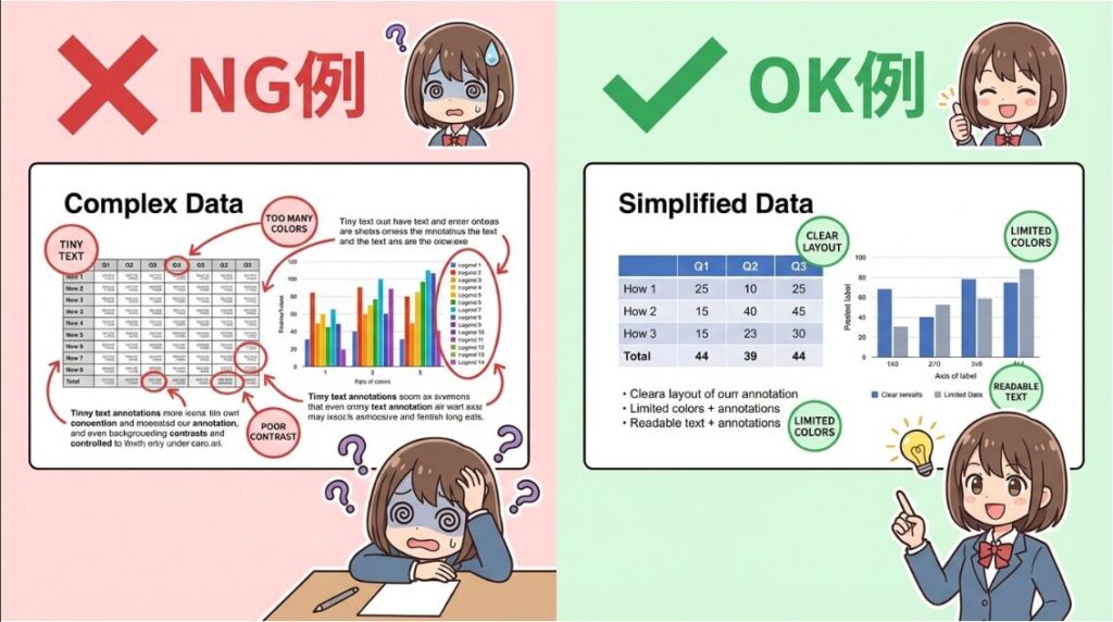 • 複雑な表は要点だけ抜き出して簡潔に示します。注釈や凡例は短くします。