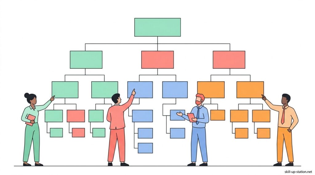 WBSでは、プロジェクト全体の作業を最上位から工程単位、タスク単位へと分解し、1つのタスクが1人で1日から3日以内に完了できる粒度まで細分化して記載します。各タスクには開始日と終了日を日付で設定し、担当者を1名に固定して責任範囲を明確にします。