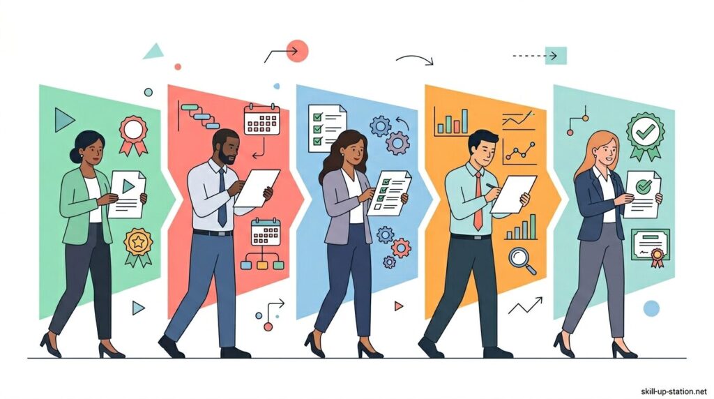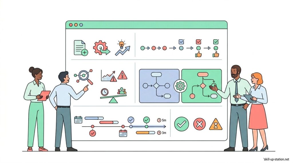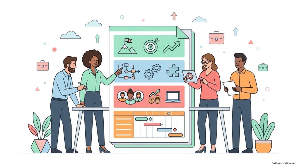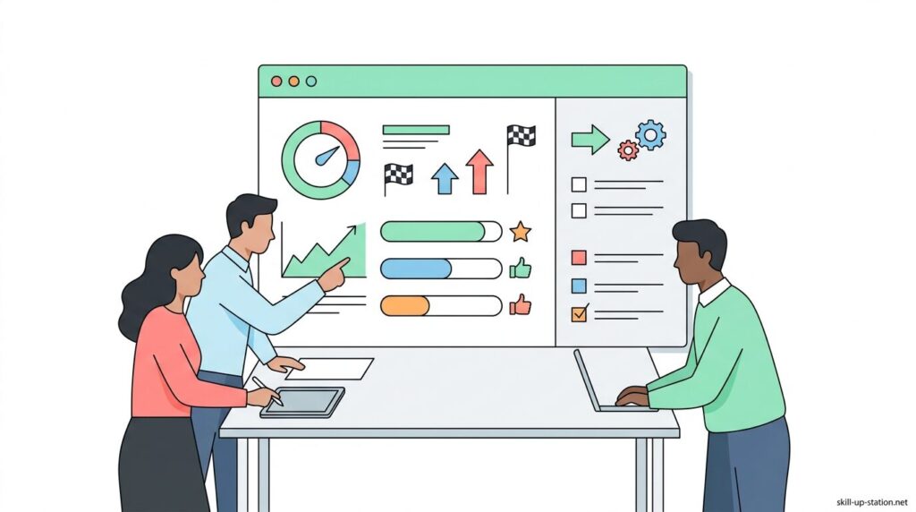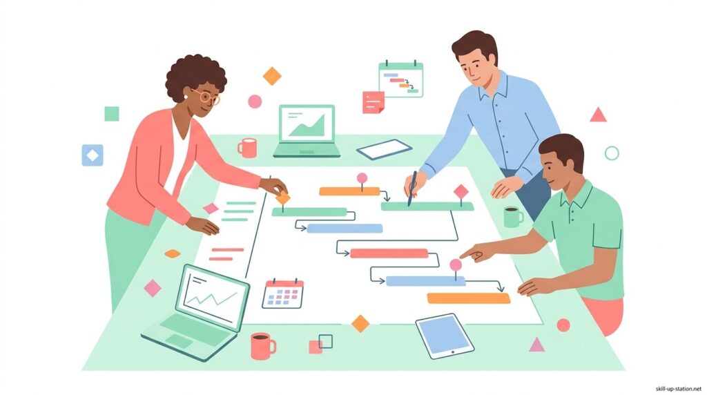 プロジェクトマネジメントでは、開始前に計画書やスコープ定義書で作業範囲・納期・担当者を数値と条件で確定し、WBSやスケジュール計画書でタスクを1日から3日単位に分解して日付ベースで管理します。